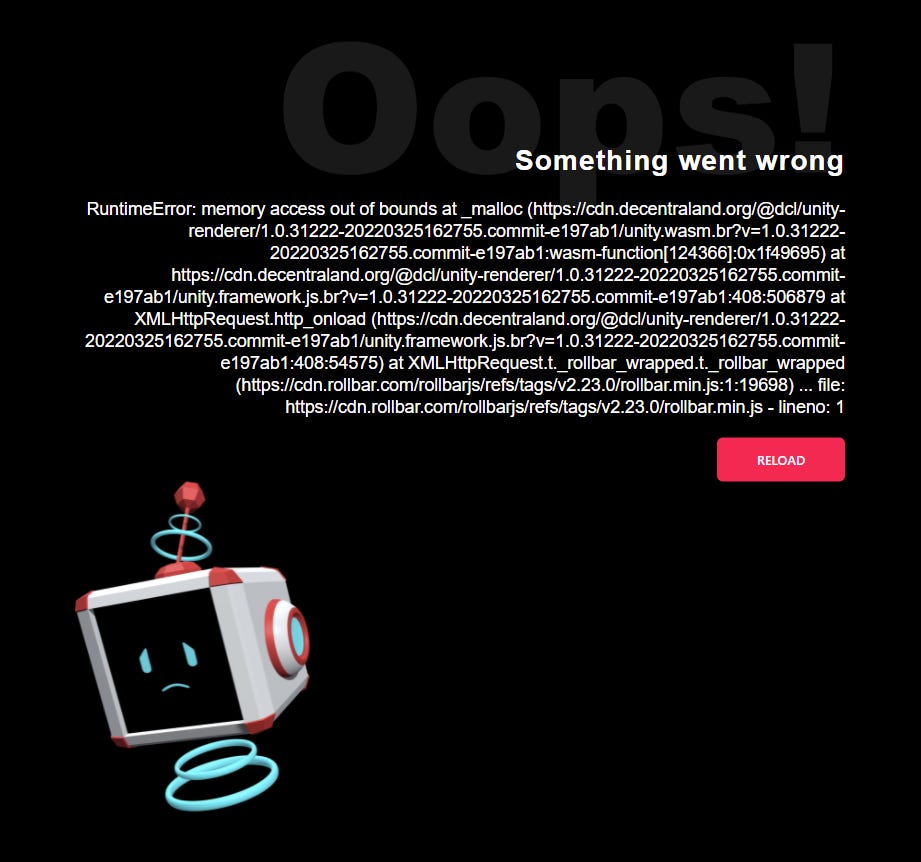 Recently, I tried out Decentraland on a web browser. Unfortunately, my browser likely ran out of memory (or maybe just memory access issue) after some time and ended up with the following “Oops!”.